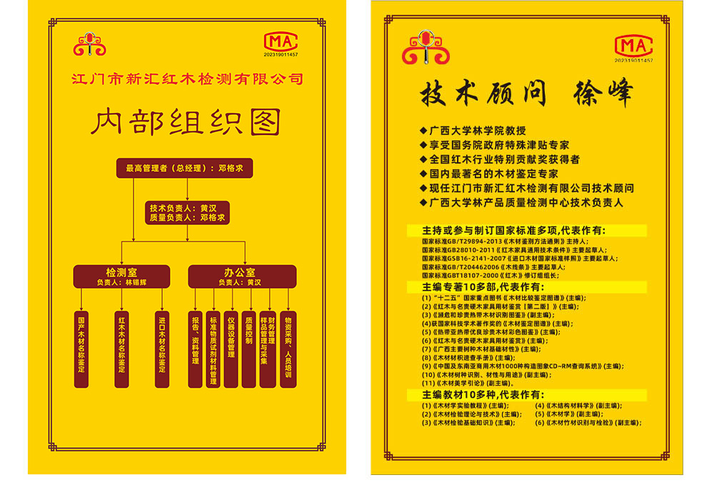 江門市新匯紅木檢測有限公司位于中國古典家具三大流派“廣作”的發(fā)源地廣東新會的紅木專業(yè)市場新會古典家具城。在中國古典家具之都博覽中心的三樓擁有日常檢測及辦公場地約625平方米,由國內(nèi)紅木材質(zhì)鑒別三大權(quán)威專家之一、享受國務(wù)院特殊津貼的廣西大學(xué)林學(xué)院徐峰教授任總顧問。公司技術(shù)力量雄厚、檢測儀器先進(jìn)齊全,可開展木塊取樣及家具無損檢測。擁有多名木材研究博士、碩士、中級工程師、助理工程師等科研人員和多名專家顧問團(tuán)隊,每年在專業(yè)雜志刊物發(fā)表論文多篇;擁有國內(nèi)外紅木及名貴硬木木材標(biāo)本200多種,永久顯微切片300多種;每年開展紅木檢測業(yè)務(wù)4,000單以上。同時公司還擁有進(jìn)口高新技術(shù)設(shè)備工業(yè)CT射線透視儀、3D立體彩色掃描儀等先進(jìn)設(shè)備,對家具質(zhì)量進(jìn)行專業(yè)檢測并提供產(chǎn)品質(zhì)量的參考意見。